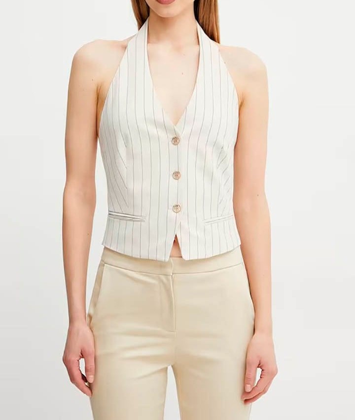 Colete Fracomina ajustável gola halter riscas finas e bolsos falsos
