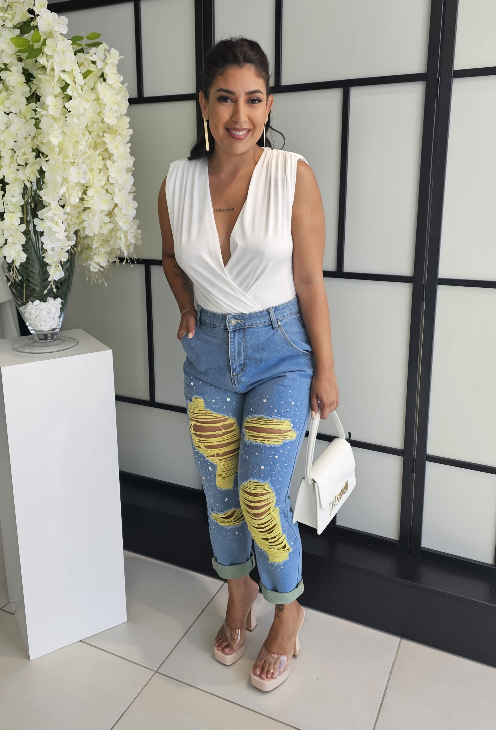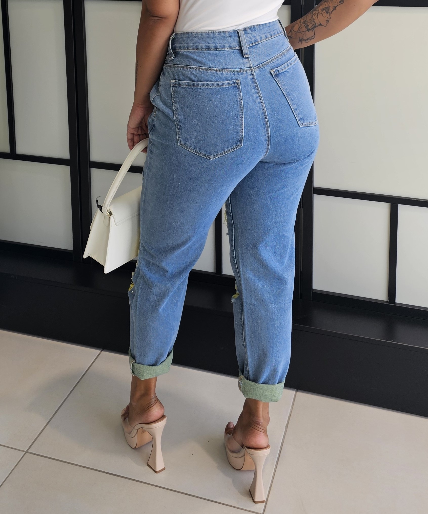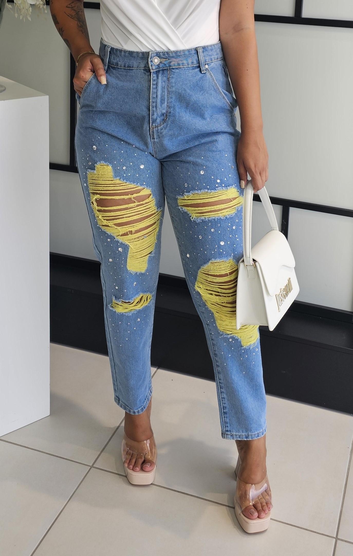 Calça Jeans Marisa Mole detalhes verde lima e brilhantes