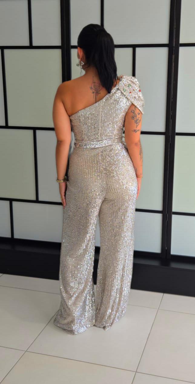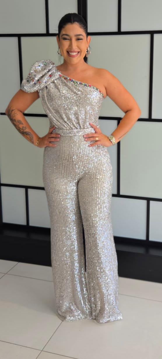 Macacão Marisa Mole em lantejoulas alça única c/aplicação de pedrarias coloridas no ombro e no decote