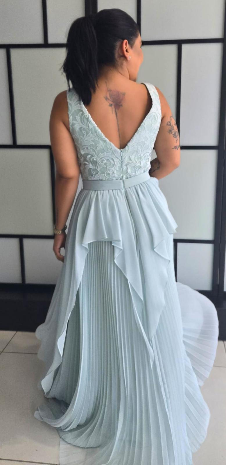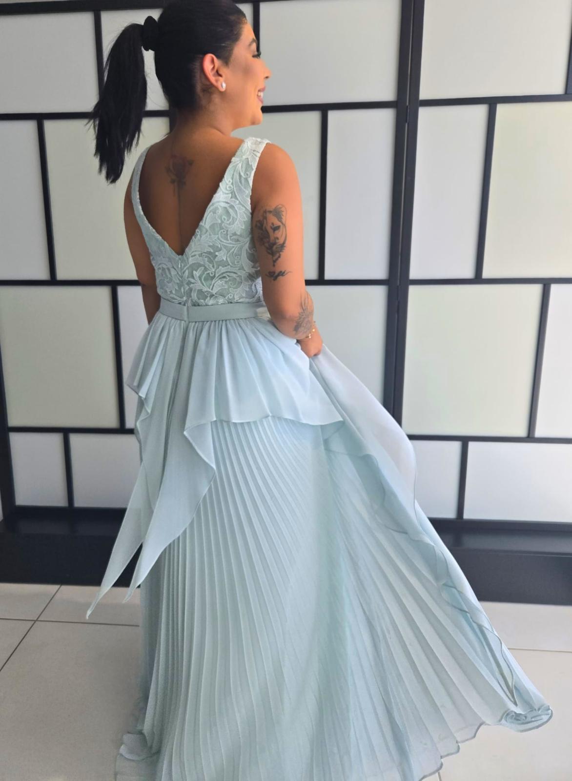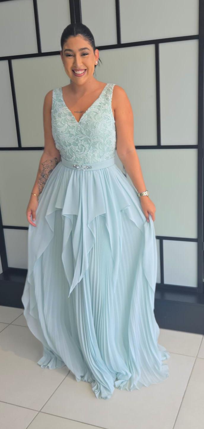 Vestido Evassé renda guipir na parte superior e saia plissada c/tecido sobreposto