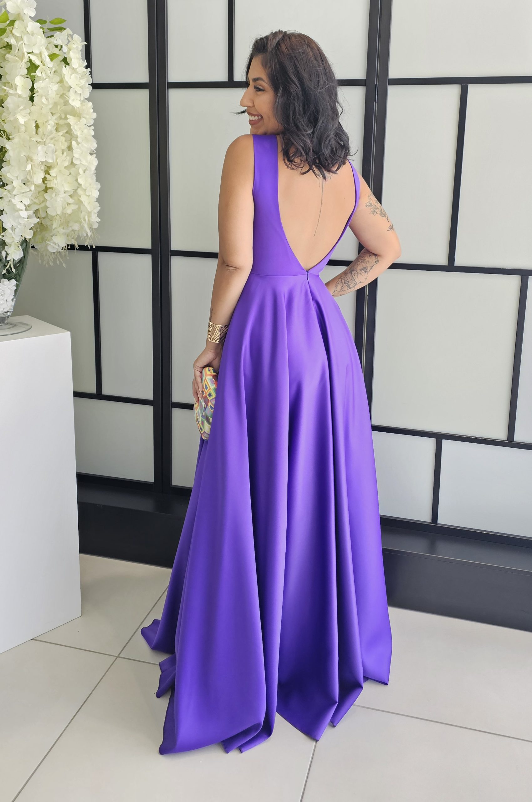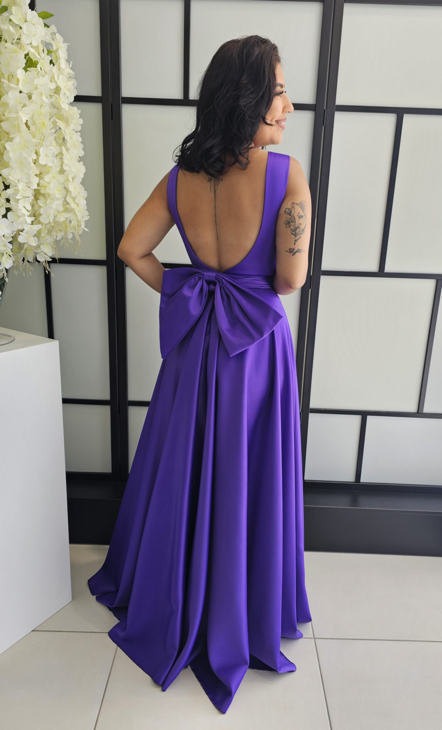Vestido Marisa Mole cetim grosso costas decotas e laço amovível