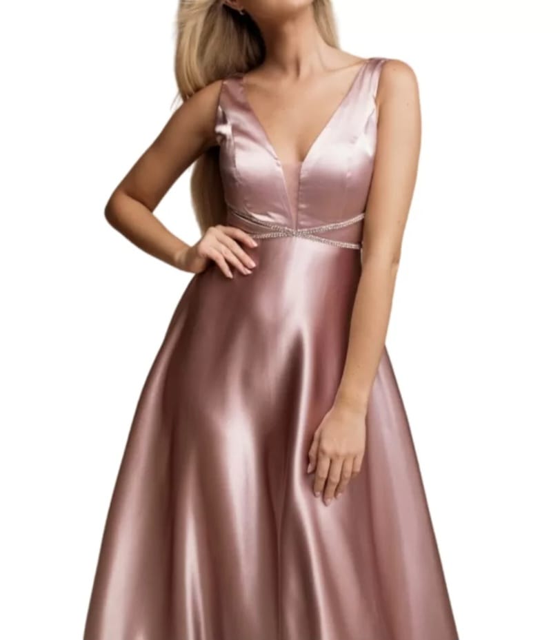 Vestido Marisa Mole cetim c/ brilhantes abaixo do peito e transparência no decote