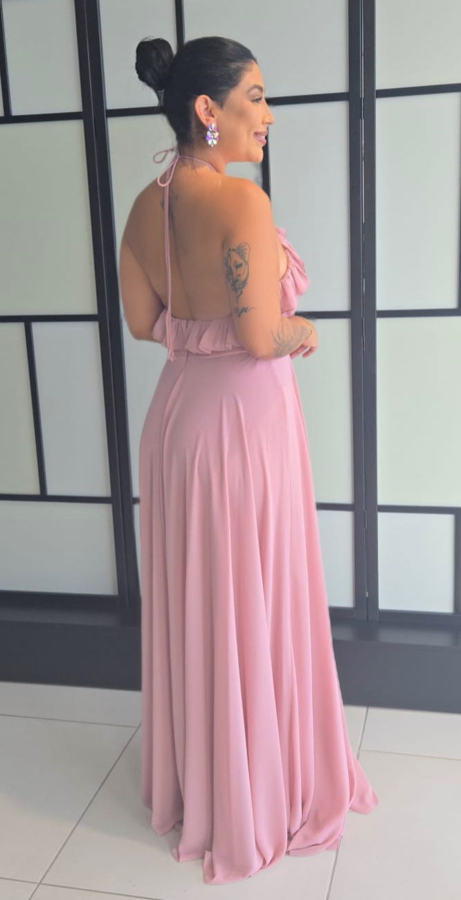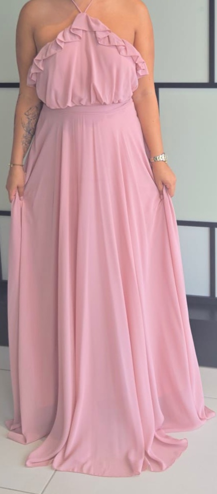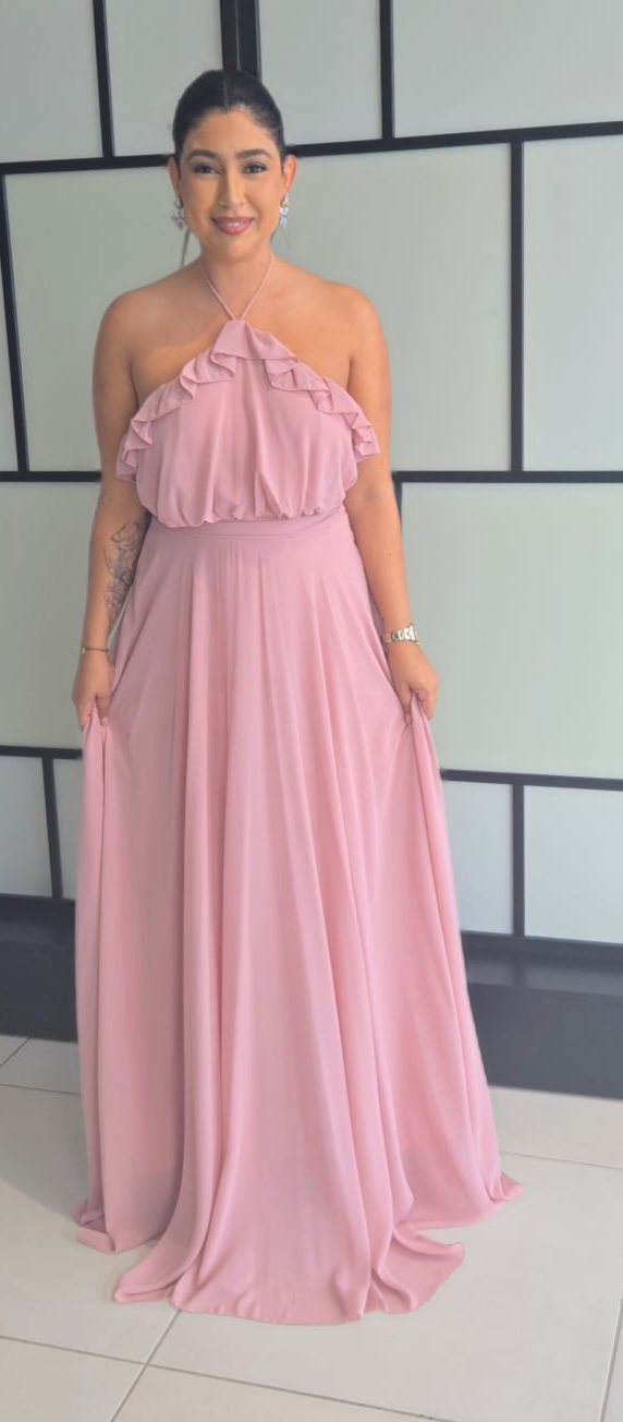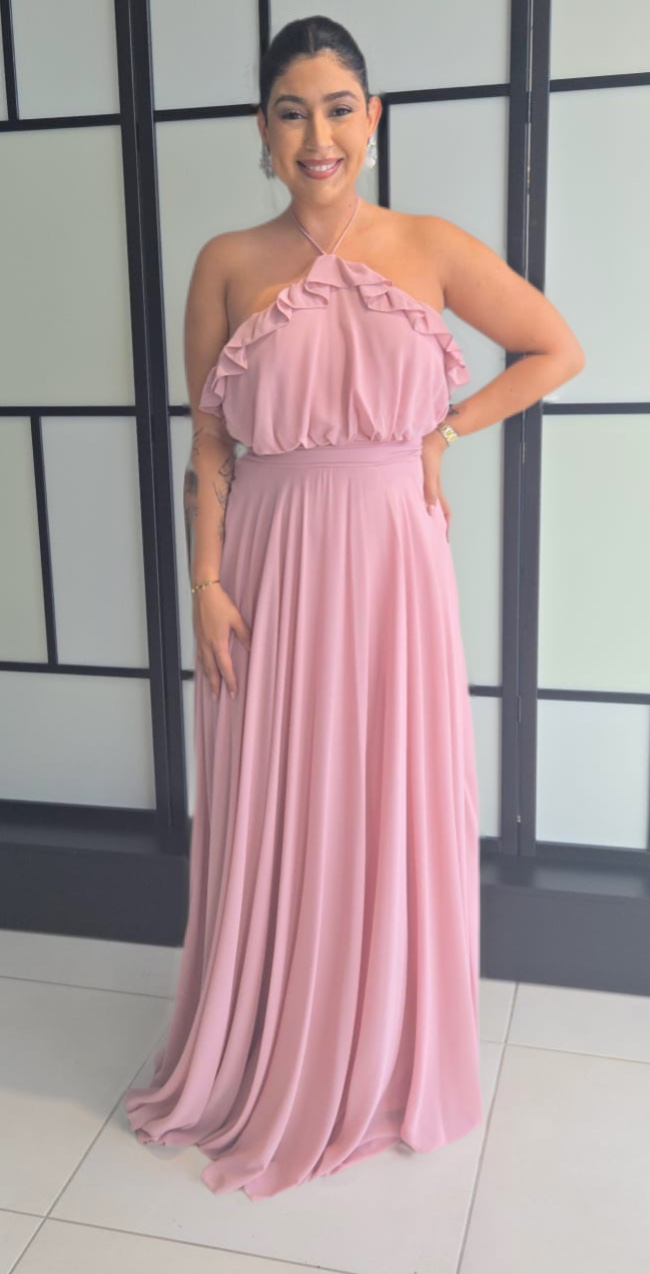 Vestido Marisa Mole cintado ata no pescoço peito c/folhos no decote