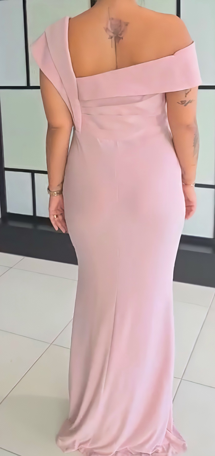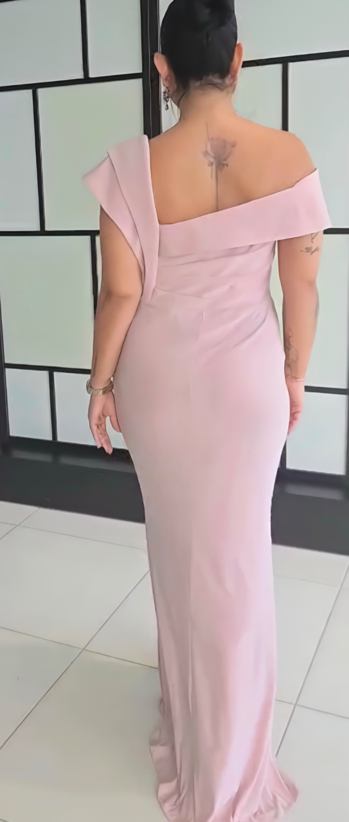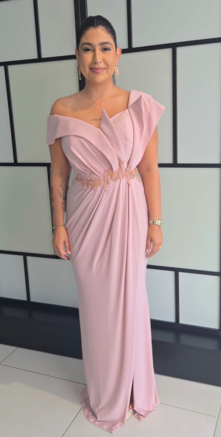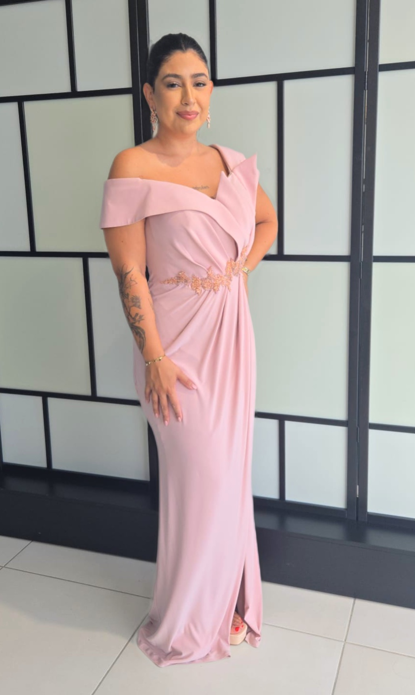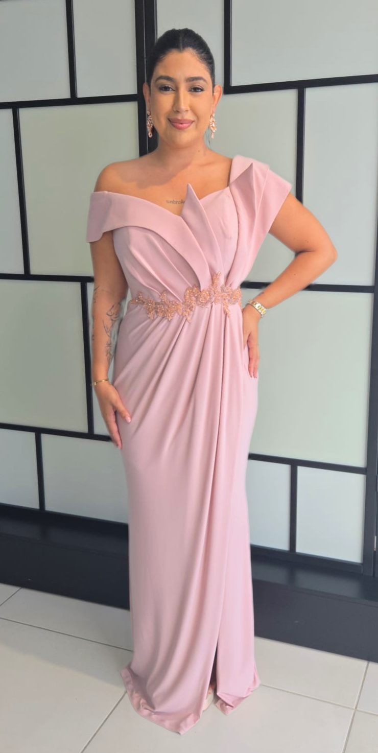 Vestido Marisa Mole decote bardot ombro saliente drapeado c/aplicações em renda e missangas na cintura