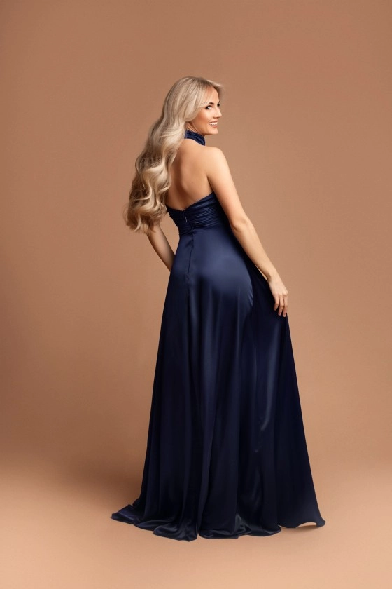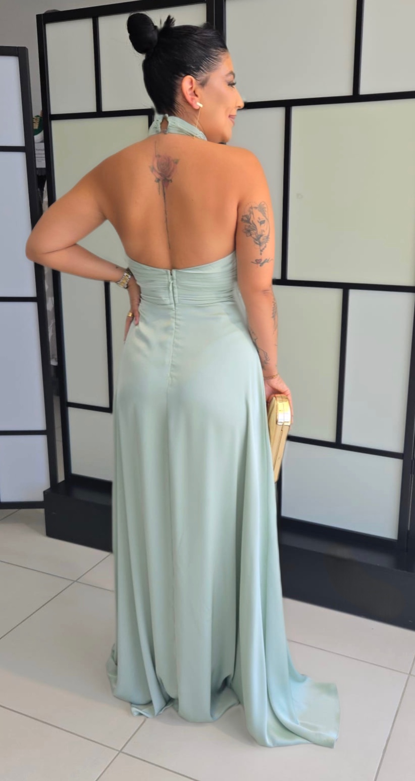 Vestido Marisa Mole cetim atar no pescoço e abertura no peito
