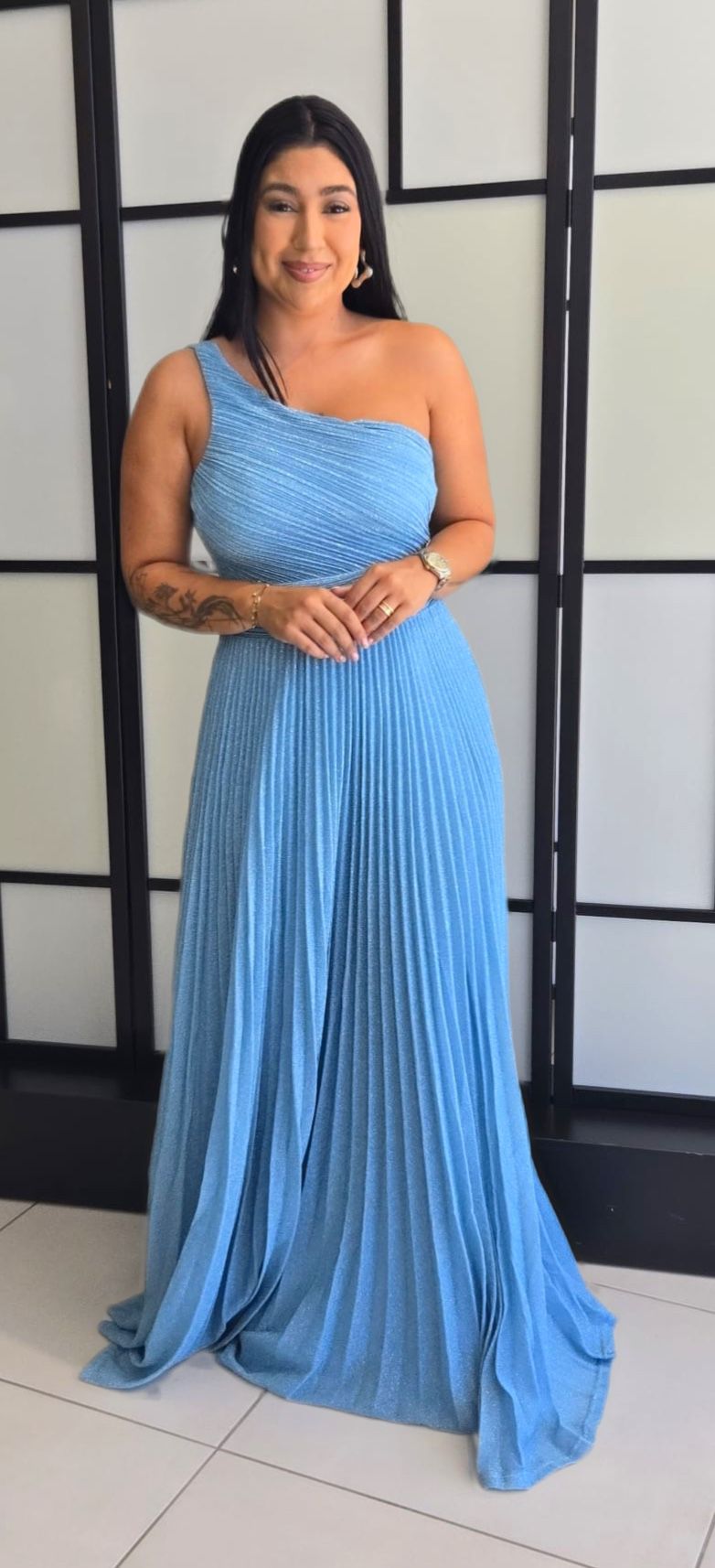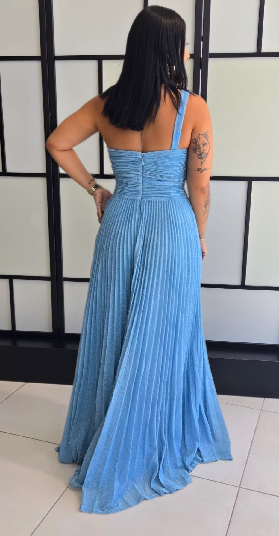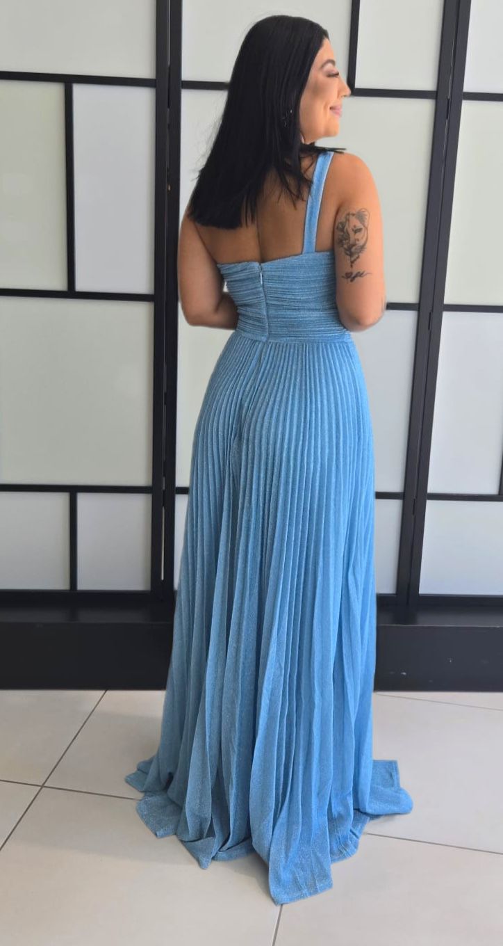 Vestido Marisa Mole estruturado brilho ligeiro peito c/pregas diagonais e saia plissada
