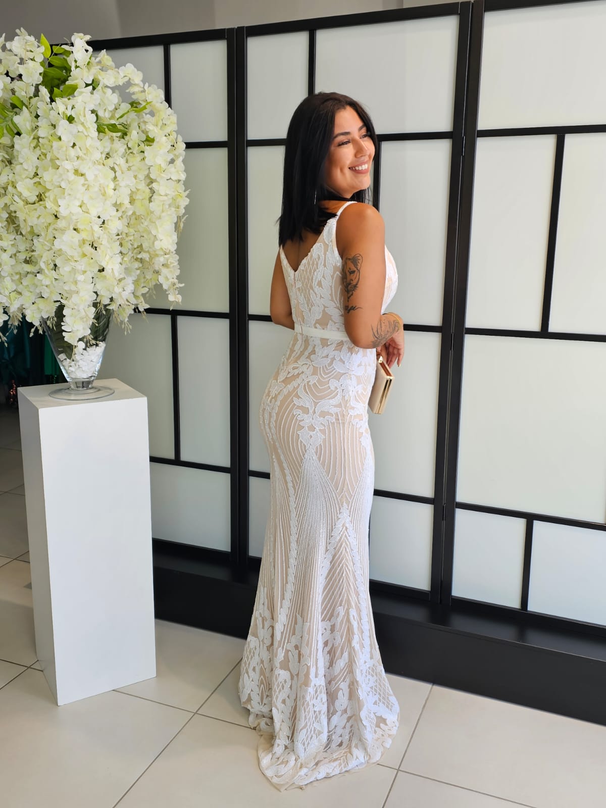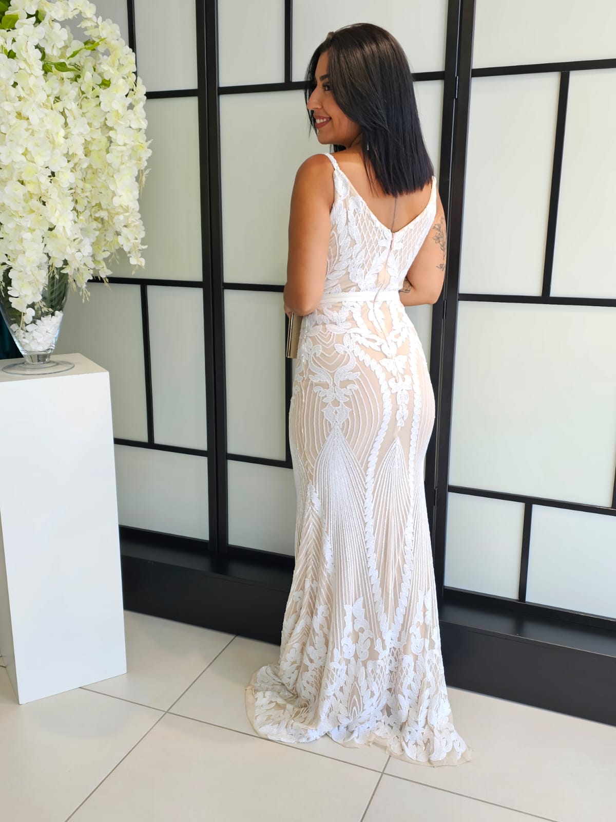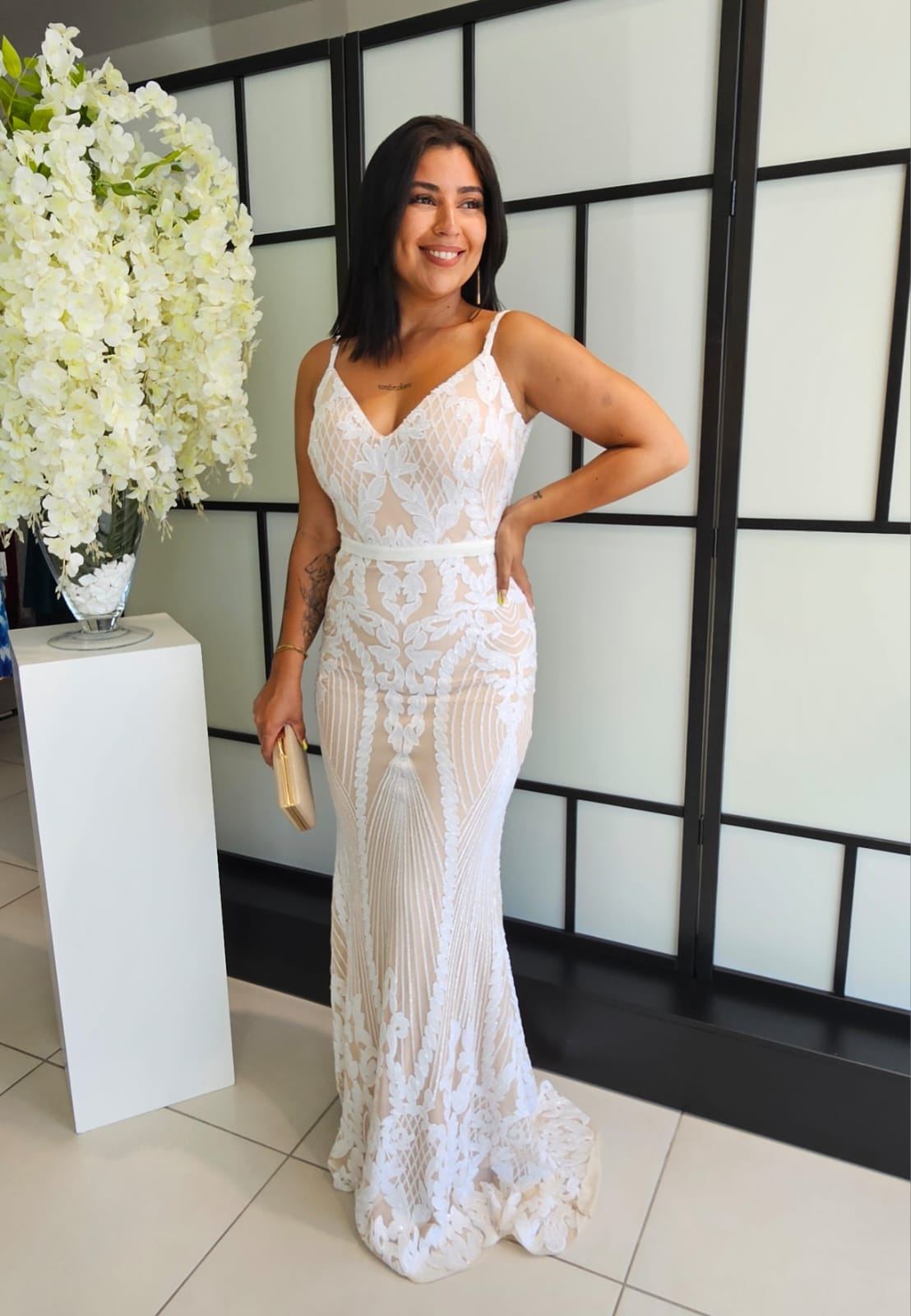 Vestido Marisa Mole fundo bege c/lantejoulas brancas