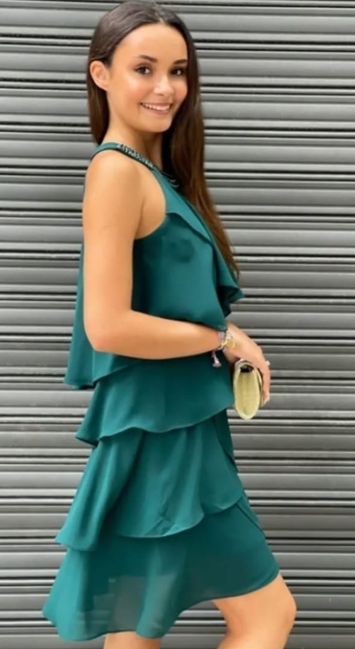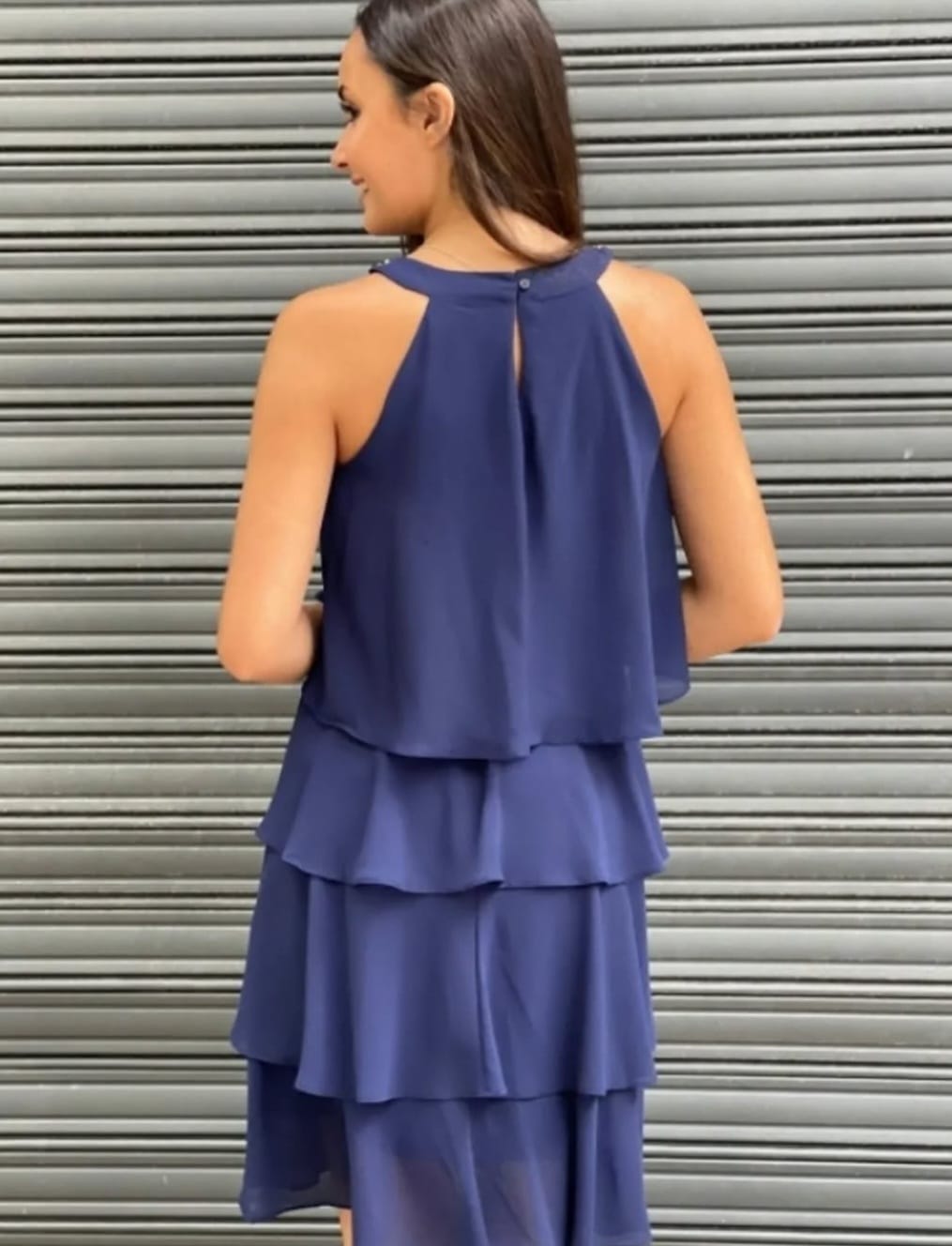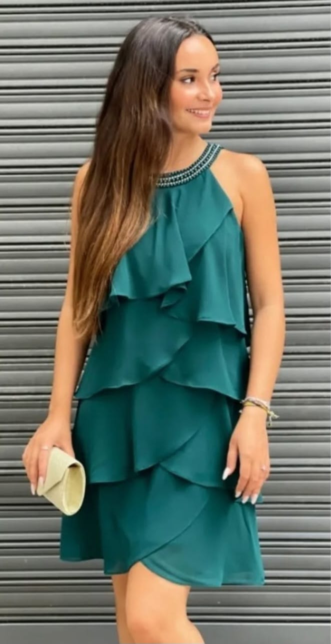 Vestido Marisa Mole folhos em cascata decote c/aplicação de brilhos e pérolas