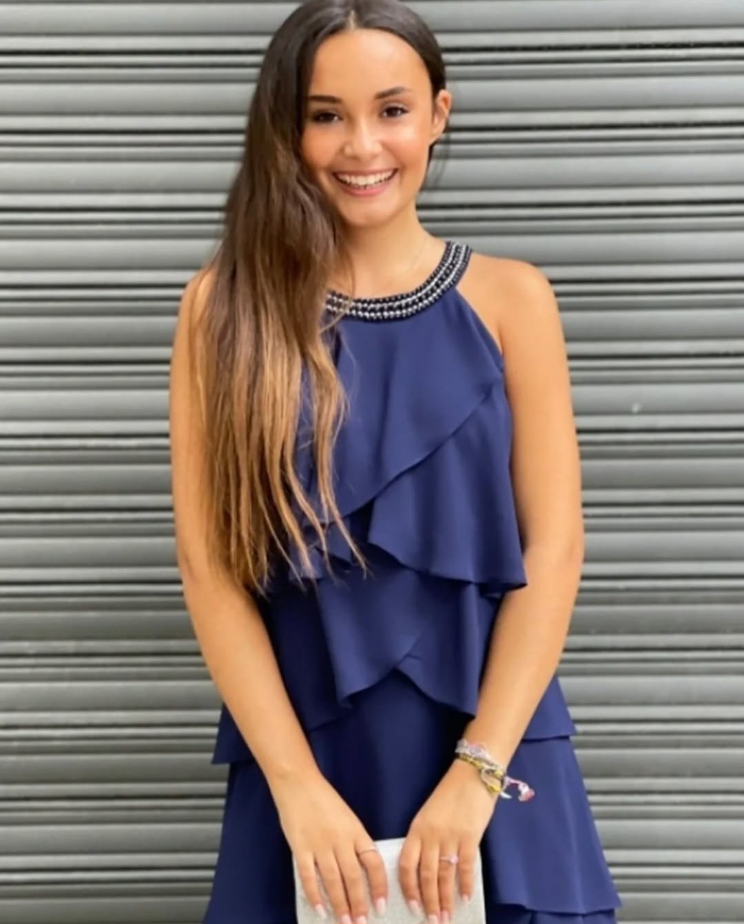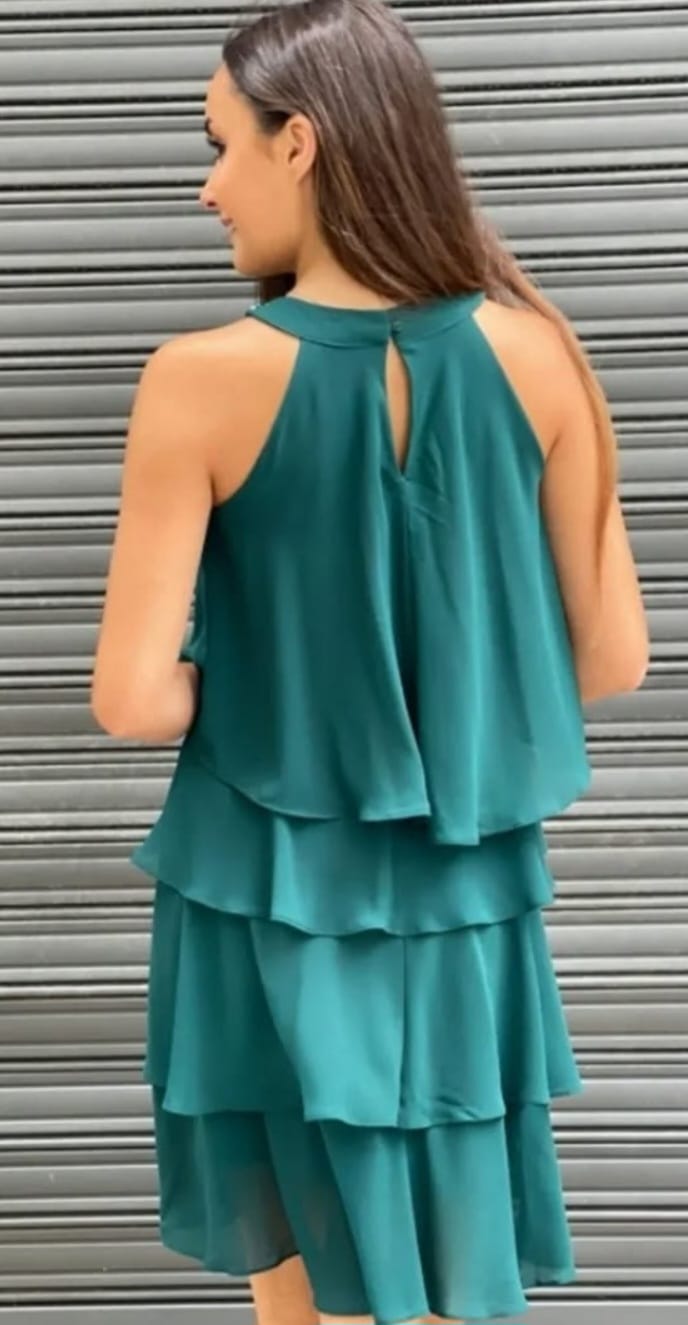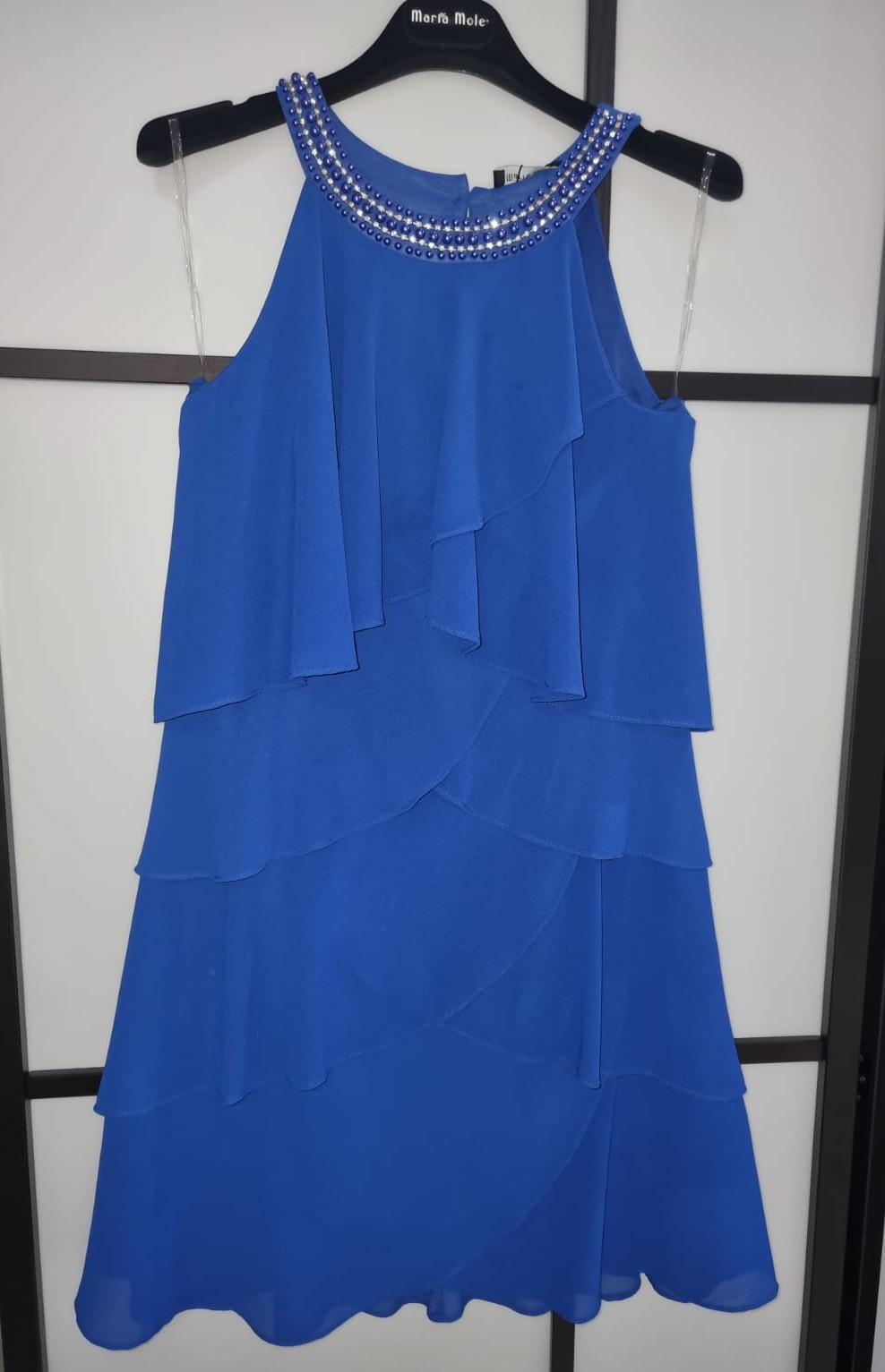 Vestido Marisa Mole folhos em cascata decote c/aplicação de brilhos e pérolas
