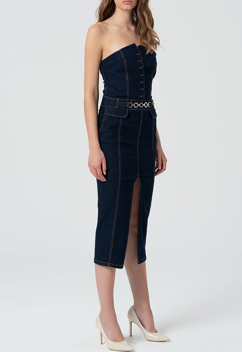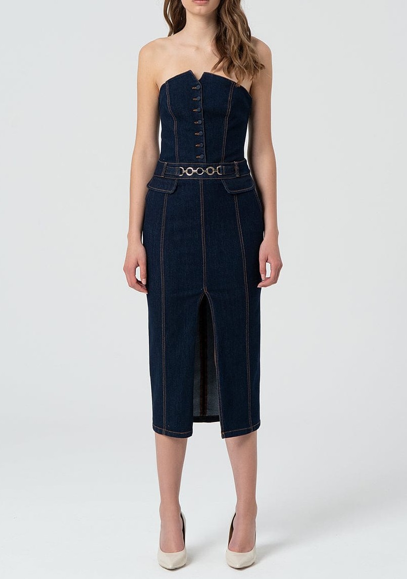 Vestido de ganga Fracomina cai-cai abertura frontal e aplique metálico na cintura