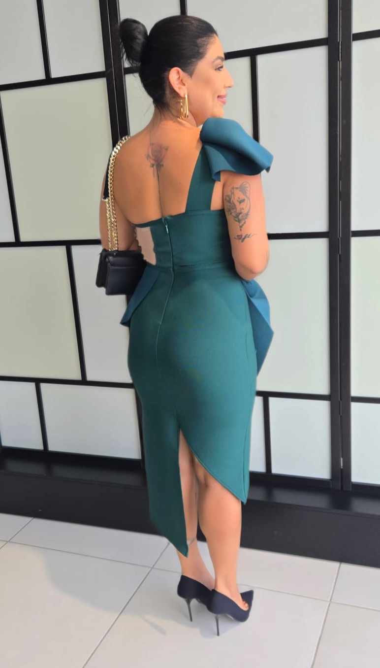 Vestido Marisa Mole de bandagem assimétrico c/sobreposições e transparência lateral